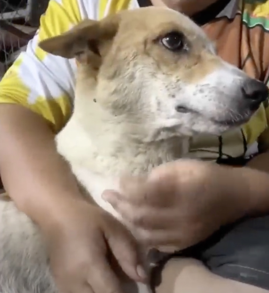 One sunny afternoon, a short video captured her sitting in a bright courtyard. Her seven puppies played all around her, chasing one another, discovering the world she fought to give them. Saria watched quietly, tail moving slowly, content.