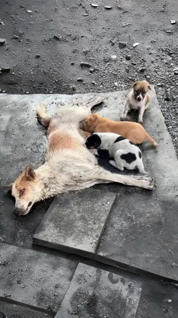 Days passed. Hunger. Thirst. Untreated injuries. Still, she remained motionless beside her puppies, shielding them with her body and responding to their cries even as her strength faded.