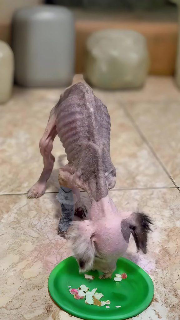His skin, damaged by cold and neglect, was treated gently with soothing ointments. Warm baths helped ease his discomfort. Three days after arriving at the clinic, he took his first bites of food — tiny, careful nibbles that brought quiet smiles to everyone watching.