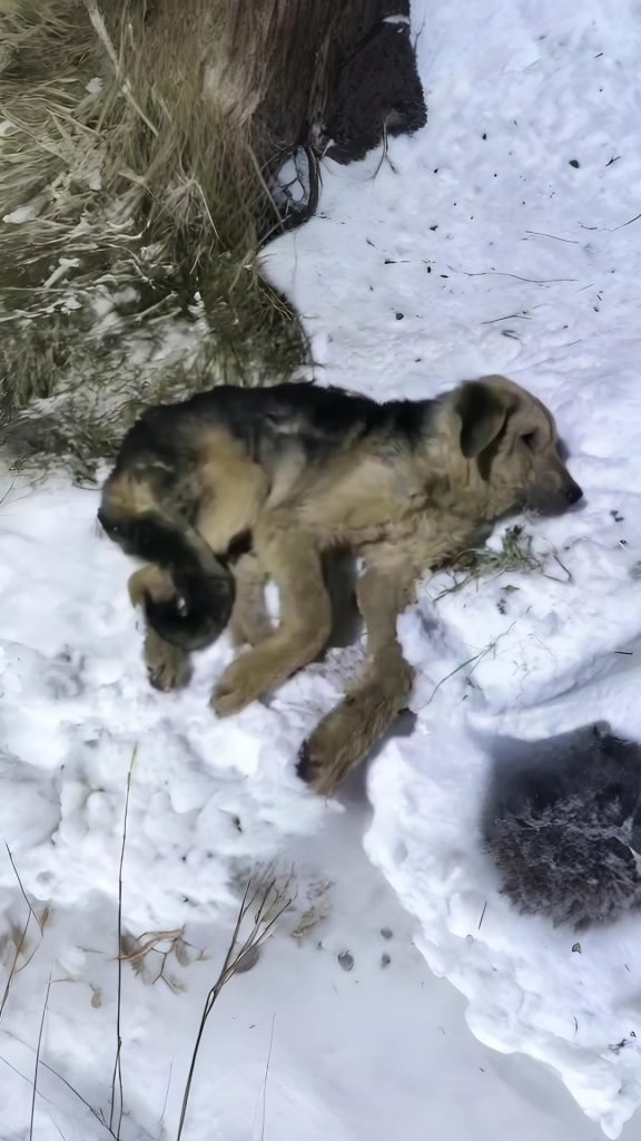 A dog lay curled in the snow, almost indistinguishable from the frozen earth around him. His limbs trembled uncontrollably, and each breath came fast and shallow, as though he were running out of time. Ice clung to his fur, stiffening it into sharp clumps. He didn’t cry out. He didn’t move. He simply endured.