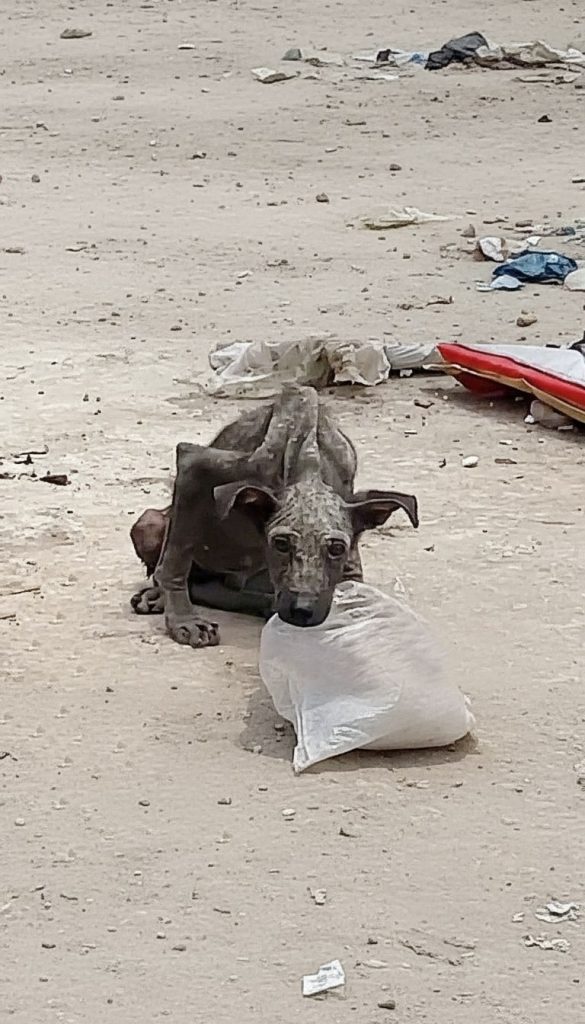 Near a trash pile on the edge of the road, he lay still, so thin it was difficult to tell where his body ended and the debris began. His ribs pushed sharply against his skin. Large patches of fur were gone, replaced by raw, irritated flesh. From a distance, many people thought he was already dead. Those who looked closer described him as more skeleton than dog—a life worn down by hunger, disease, and constant fear.